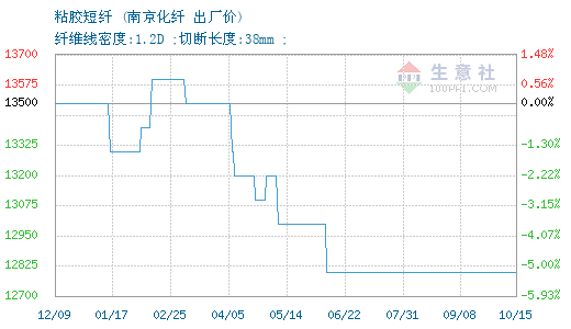10月15日南京化纤关于粘胶短纤的报价为12800元/吨。粘胶短纤的属性:纤维线密度:1.2D ;切断长度:38mm ; 。该报价有效期为3天。