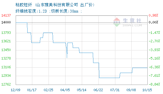 10月15日山东雅美科技有限公司关于粘胶短纤的报价为13100元/吨。粘胶短纤的属性:纤维线密度:1.2D ;切断长度:38mm ; 。该报价有效期为3天。