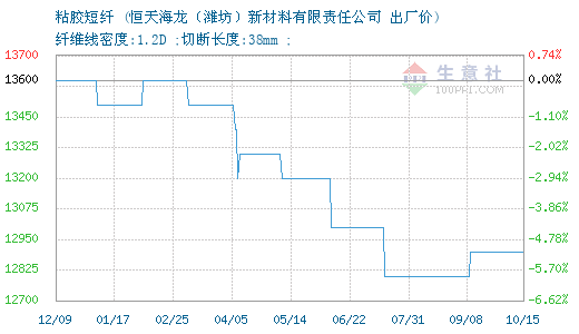10月15日恒天海龙(潍坊)新材料有限责任公司关于粘胶短纤的报价为12900元/吨。粘胶短纤的属性:纤维线密度:1.2D ;切断长度:38mm ; 。该报价有效期为3天。