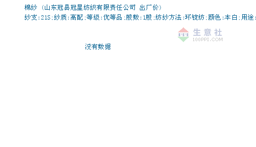 04月15日山东冠县冠星纺织有限责任公司关于棉纱的报价为24500元/吨。棉纱的属性:纱支:21S;纱质:高配;等级:优等品;股数:1股;纺纱方法:环锭纺;颜色:本白;用途:针织。该报价有效期为3天。