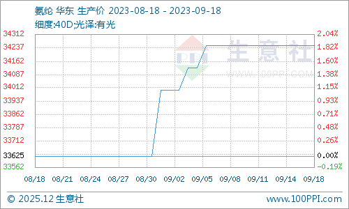 近期国内氨纶市场行情维稳运行,据生意社商品行情分析系统,截止9月18日40D氨纶价格为34250元/吨,行业整体开工72%附近,成本端支撑松动,下游稍有回暖。