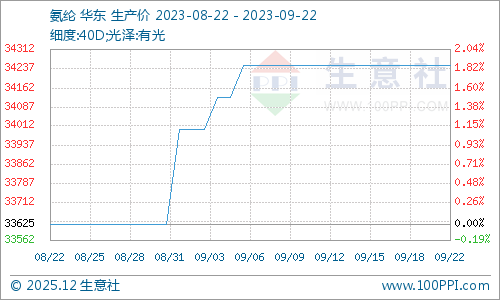 据生意社商品行情分析系统,本周(9月18-22日)国内氨纶市场行情维稳运行,截止9月22日40D氨纶价格为34250元/吨,较周初持平,同比下跌0.36%。行业整体开工72%附近,