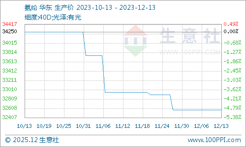 据生意社商品行情分析系统,进入12月份国内氨纶市场行情维稳,截止12月13日40D氨纶价格为32575元/吨,较月初持平,同比下跌9.51%,行业开工维持在72%附近。